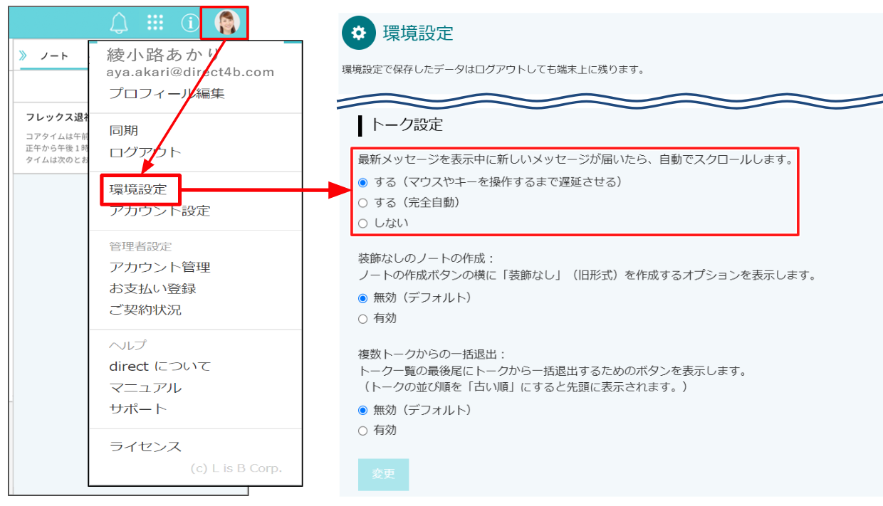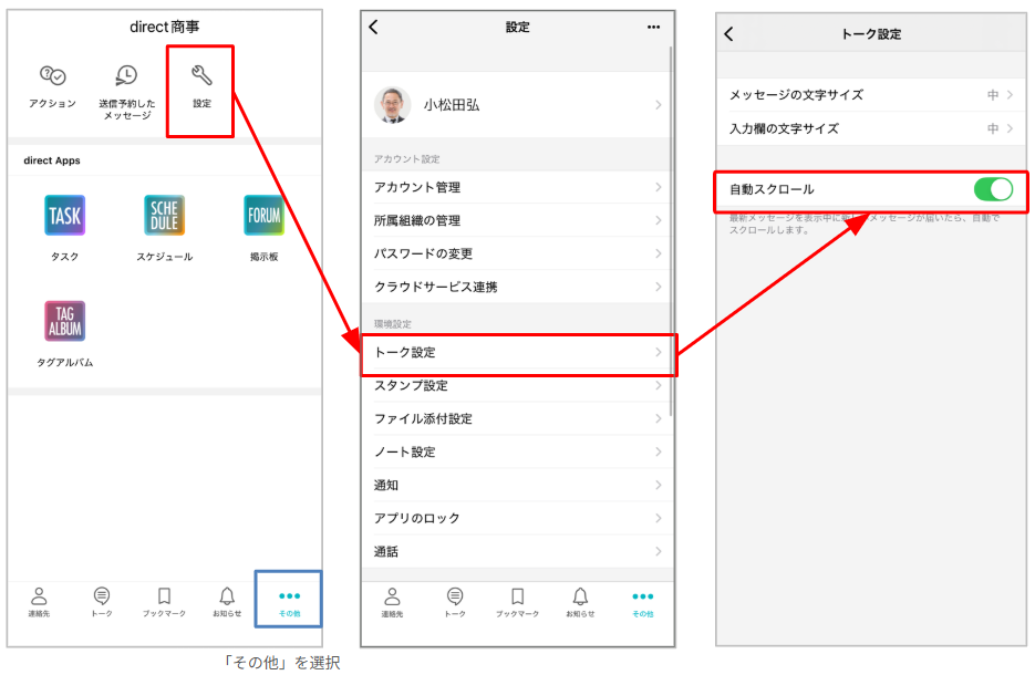 direct画面右上の丸いアイコン→[環境設定]→[トーク設定]の