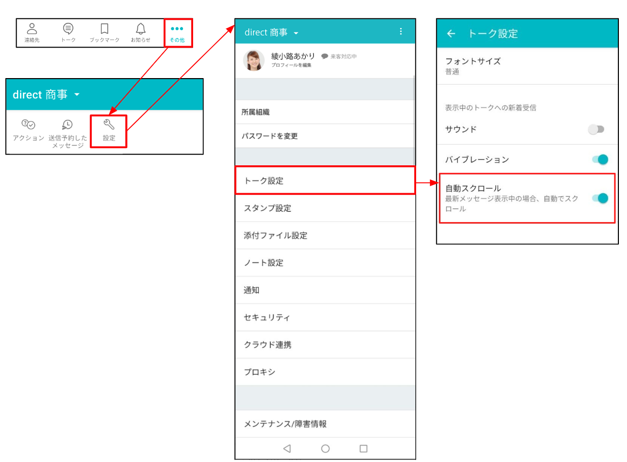アプリ画面右下の[その他]→[設定]→[トーク設定]の「自動スクロール」をオフ