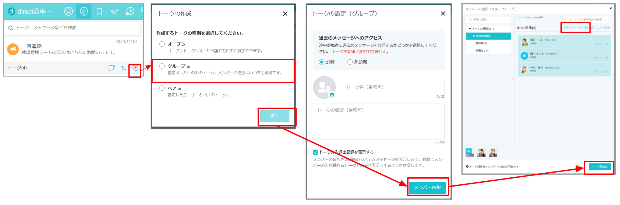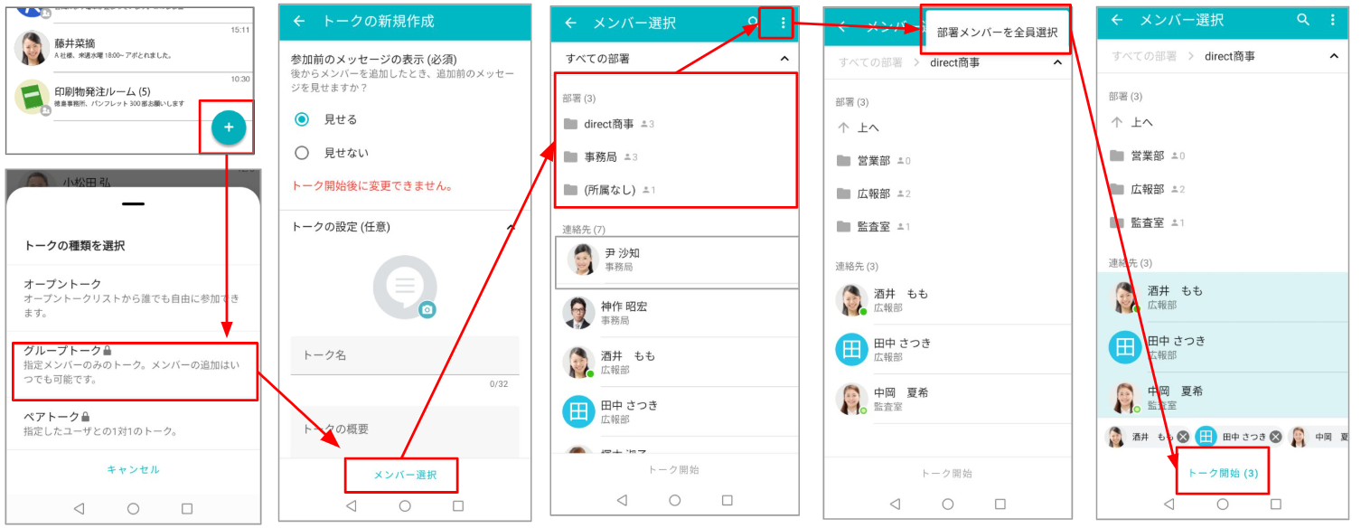 部署メンバー全員をふくめたグループトークを作成したいです。