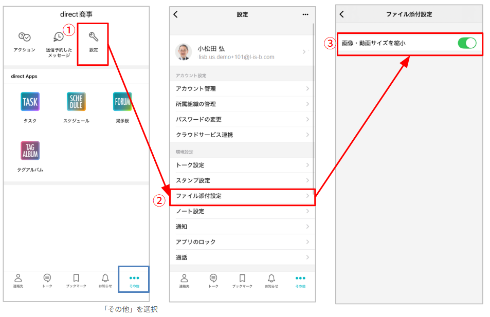 ファイル添付設定の「画像・動画サイズを縮小」が初期値でオンになっています。