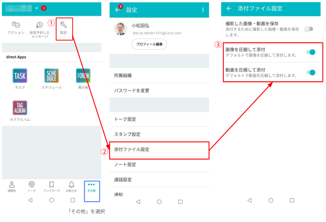 - [画像を圧縮して添付]と[動画を圧縮して添付]のいずれか、または両方のトグルを「オフ」に変更する