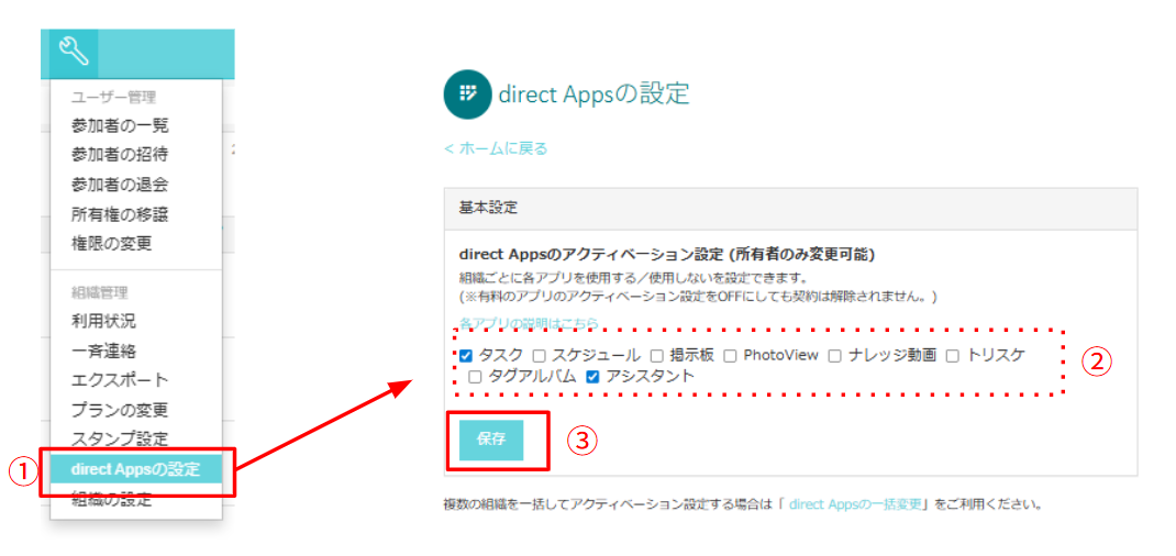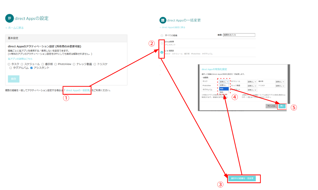 - [選択中の組織を一括変更]をクリックし「direct Appsの有効化設定」画面へ遷移