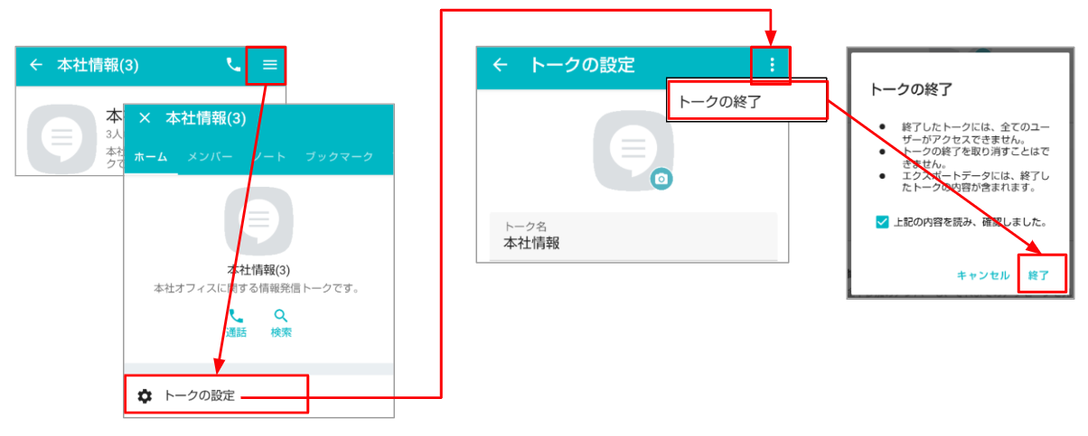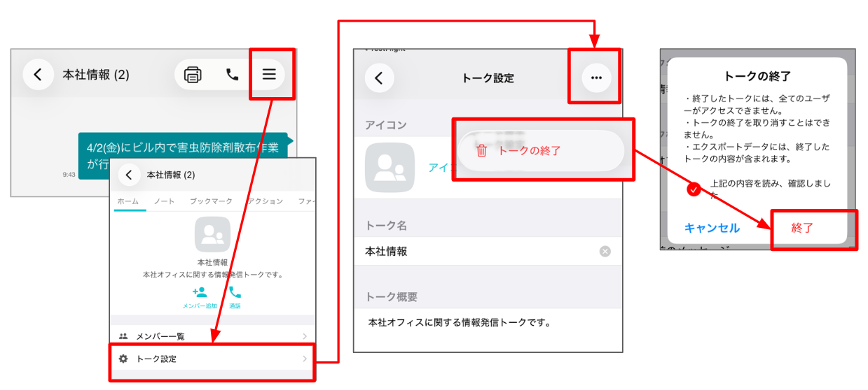 - 画面右上に表示される縦に並んだ[・・・]→[トークの終了]をタップ