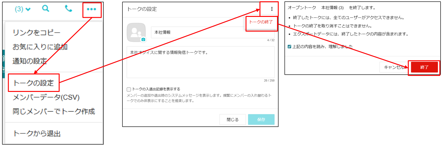 - 画面右上に表示される縦に並んだ[・・・]→[トークの終了]をクリック