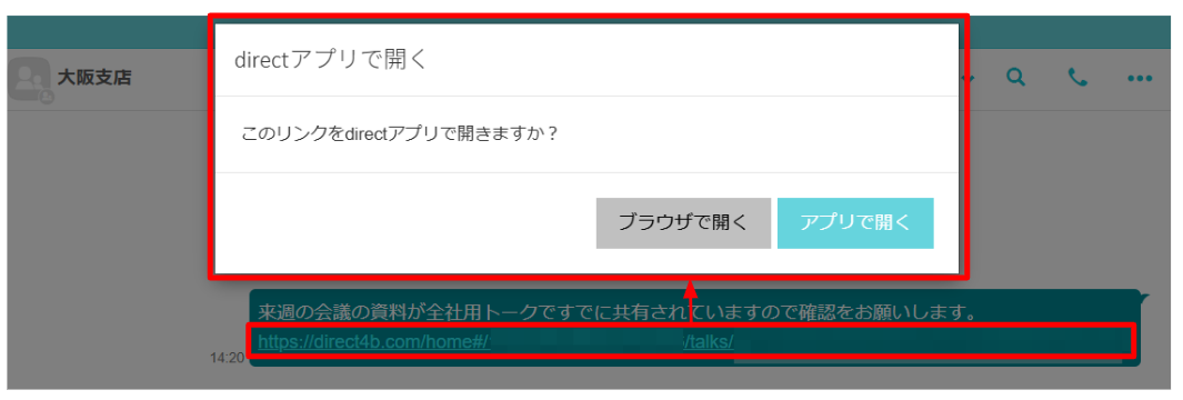 リンク(メッセージ/トーク/ノート)をクリックすると、「directアプリで開く」 ダイアログが表示されます。