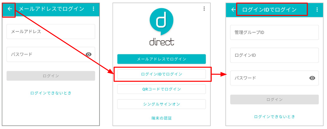 - 「メールアドレスでログイン」画面でログインをしようとしている場合は場所が異なりますので、左上のマークを押して1画面戻り、「ログインIDでログイン」画面よりログインをおこなってください。