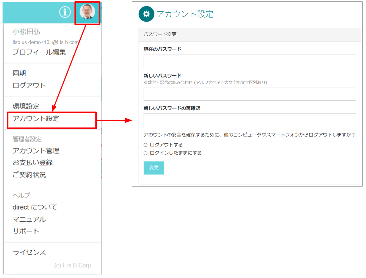 - ログインしているとき 画面右上の丸いアイコン→[アカウント設定]からパスワードを変更することができます。