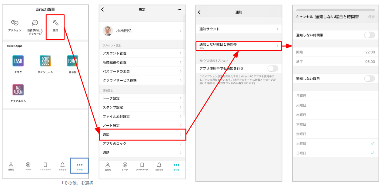 - [その他]→[設定]→[通知]→[通知しない曜日と時間帯]