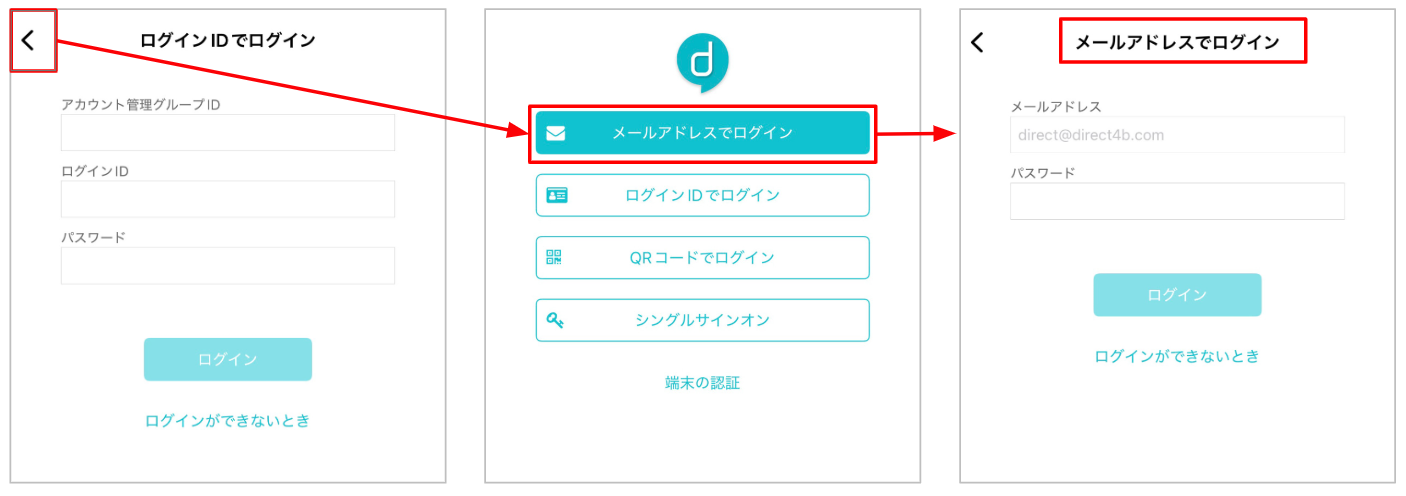 - 「ログインIDでログイン」画面でログインをしようとしている場合は場所が異なりますので、左上のマークを押して1画面戻り、「メールアドレスでログイン」画面よりログインをおこなってください。