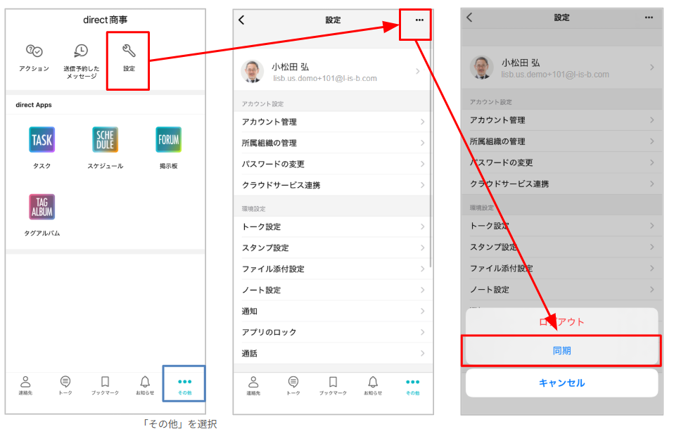 [その他]→[設定]→画面右上に表示される[・・・]→[同期]から同期できます。