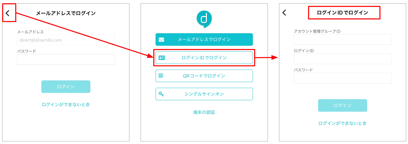 - 「メールアドレスでログイン」画面でログインをしようとしている場合は場所が異なりますので、左上のマークを押して1画面戻り、「ログインIDでログイン」画面よりログインをおこなってください。